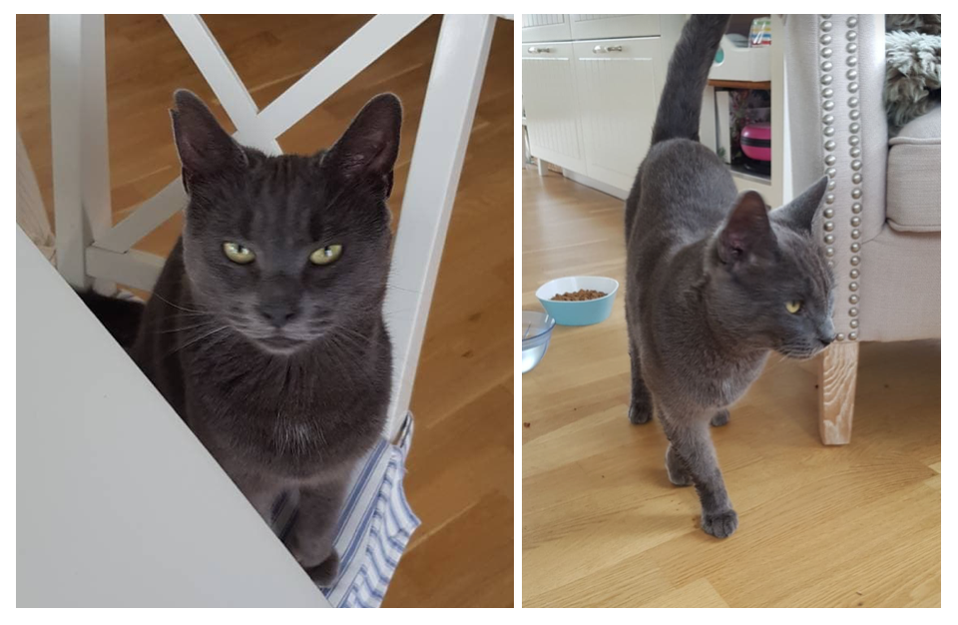 Grå, korthåret hannkatt fløy litt gårdimellom her på Teie/Vestskogen, men de to siste ukene har han holdt seg her. Han er ukastert, virker ung (flotte tenner og klør), er leken og alltid sulten. Han har muligens betennelse i ørene, rister på hodet og lukter litt vondt fra øregangen. Kan ikke kjenne noen chip, men han virker skeptisk til nærgående inspeksjon så ikke helt sikker.