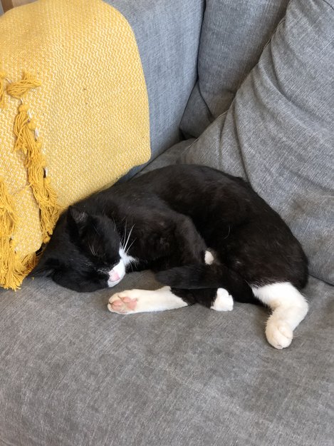 Slank, ung, velstelt katt. Hvit snute og poter. Sosial og glad i folk.