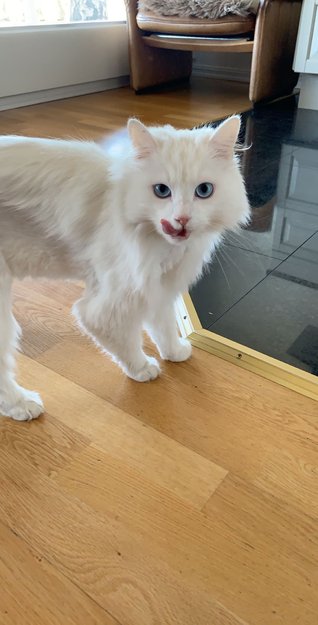 Tommi er helt hvit og langhåret. Han har knallblå øyne og er ganske sky av seg.