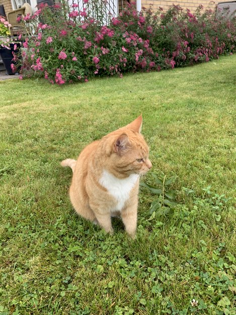 Oransje katt med stripete hale, hvitt bryst og hvite poter fulgte etter en av beboerne hjem. Veldig kjælen og kontaktsøkende. Henger utenfor terrassene til beboerne og mjauer. Har fått litt mat. Noen som drar kjensel på denne krabaten?