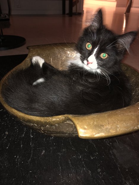 Sort og hvit litt fluffy pels. ID tatovert inn i begge ørene. Kosete og god pusegutt💕