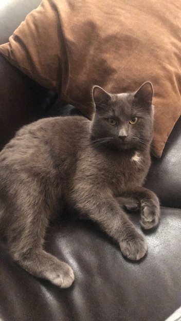 Grå hannkatt med hvit flekk på brystet. Bildet vedlagt viser ganske godt utseende hans. Født i mars 2018, så vil være omtrentlig 1 år og 4 mnd nå. Han er kosete og kontaktavhengig. Reagerer muligens på «pusen». Går ofte på bord.