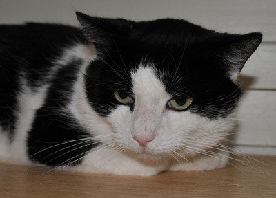 Franklin er en stor hannkatt. Mest svart med noe hvitt.
