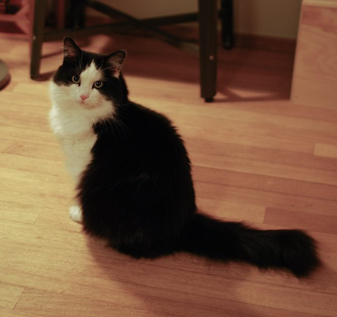 Stor tofarget hannkatt med halsbånd med bjelle og kontaktinformasjon.