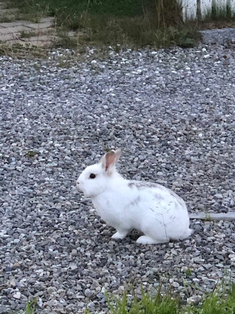 Hvit kaninen med litt lengre hår på toppen av hodet. Noen mørke svarte flekker på ryggen men usikker på om det er olje/skitt fra bil.