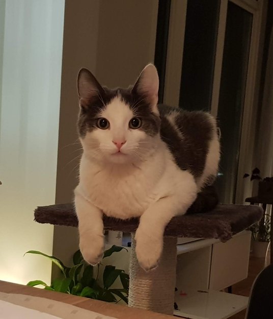 Hvit og gråd hannkatt med halvlang pels. Har en hvit L på bakkroppen og stripete hale. Føflekk på en av forpotene. Sosial og tillitsfull katt, oppsøker folk og er kosete.
