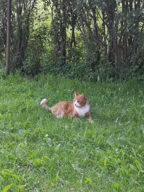 6 kg, voksen katt. Orange med hvit hals, hvite poter og hvitt ansikt med en brun flekk på høyre side ved nasen.
