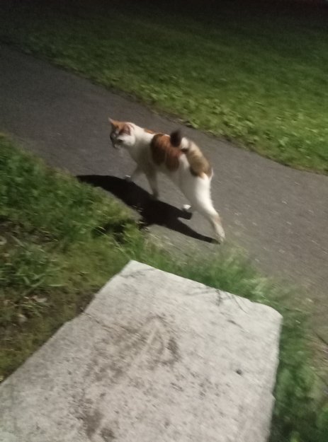 På vei fra Esso på Karihaugen og så plutselig en veldig kontaktsøkende katt stående utenfor Ludvig Karstens Vei 8. Kl er nå 01:30 og katten sitter her med meg.