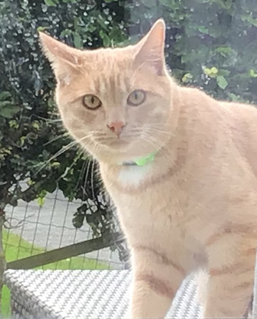 Kremfarget/rød farge, gule øyne. Gult halsbånd med navn hvis det ikke er revet av. ID-tatovering i sitt venstre øre.
