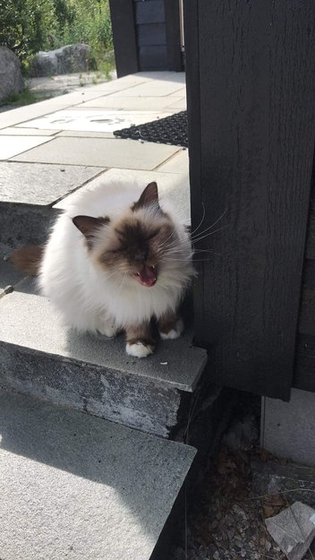 Brun maske, haletupp og poter. Hvit lang pels, blå øyne.