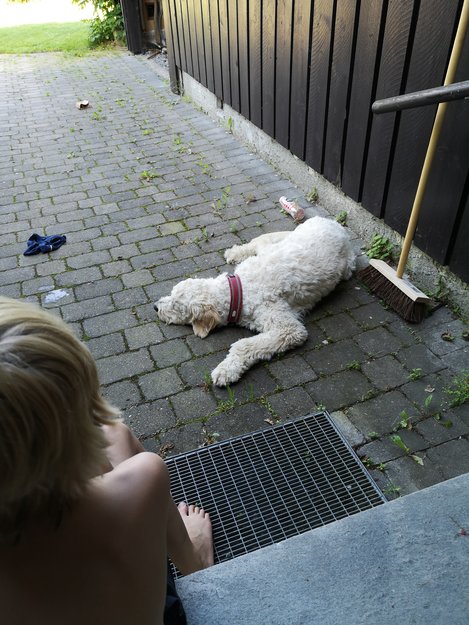 Hei. Noen naboer visste hvem som eide den. Hunden var helt utkjørt i varmen, men den kom seg etter å ha spist og drukket godt. Husk å ha tlf nr i halsbånd, så går det litt lettere å finne eieren...