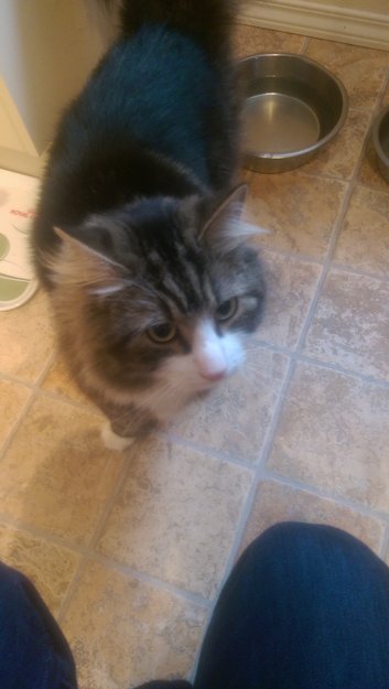 sort og brun spraglet lang pels med hvitt bryst og hvite poter, lang meget buskete hale, hvit i ansikt også og en sort flekk på høyre bakben. er meget folkesky og livredd biler og generelt sett fremmede ting. er innekatt og ikke vant til å være ute. er chipet og kastrert