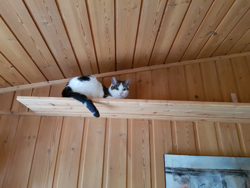 Serina er ei lita, hvit pusi med grå-brune flekker på 2 år. Halen er også grå-brun.