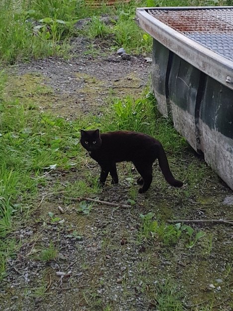Var ute å gikk tur med en liten hund som vi passer. Hørte plutselig sterk mjauing fra et tre/kratt (veldig tett). Gjemmestedet så nesten ut som et reir. Så ingenting, men katten mjauet konstant. Moren min gikk videre med hunden. Jeg var redd den var skadet og prøvde å løfte på noen greiner. Etter litt spratt den frem, fortsatt mjauende og livredd. Klarte ikke å nærme meg den, men den dro ikke av gårde. Den så ikke skadet ut, så da gikk jeg videre uten å forstyrre for mye. Hørte den fortsatt mjauet da jeg gikk langs stien, så ingen god følelse.