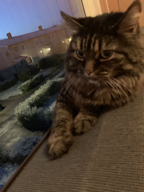 Mørk i ansiktet og litt lys pels.på halen er den litt grått hår. Hun er 11 år.kommer stort sett hvis hun ser mat eller drikke. Hun er ikke så stor som vanlige katter.