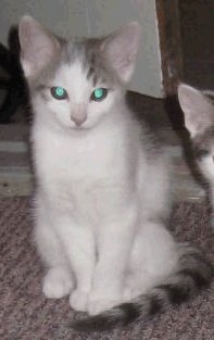 Muffy er hvit med grå felt på hodet og ryggen. Feltene er stripete og hun har stripete hale. Veldig sosial.