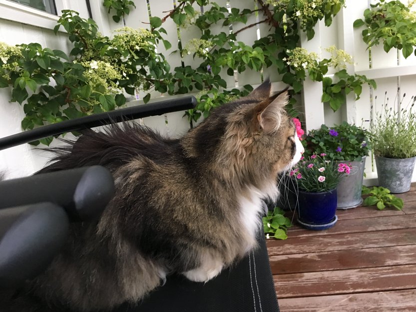 Høy, kraftig bygd med bustete hale og øretufser. 6 kg. Har sommerpels nå, men er langhåret langs ryggen.