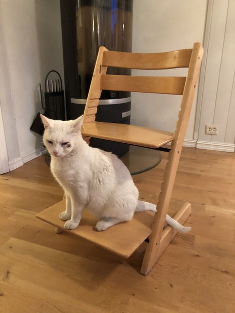 Donald er ganske så stor. Ser helt hvit ut, men har noen få svarte hår bakpå hodet og ved halen. Veldig kosete.