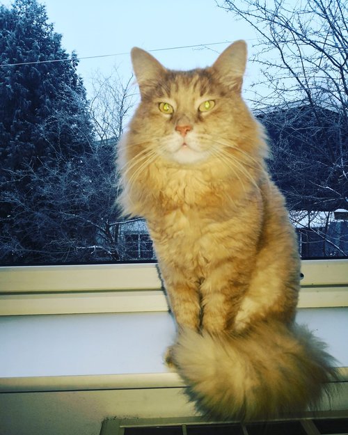 Mer langhåret enn på bildet,stor katt ( rundt 6,5 kilo) mjauer kun når han er frustrert,buskete hale.