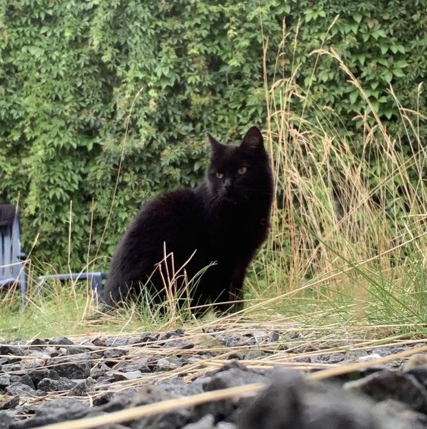 Nesten helt svart. Noen få lyse hårstrå når du er helt nærme. Virker kvikk og tillitsfull. Prøver helt klart å adoptere seg hit.