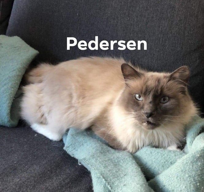 Hellig Birma, innekatt, stor 12-åring, på ferie på Langhussenteret, Ski kommune.