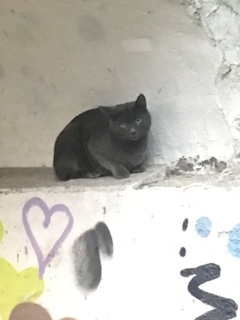Grå katt sett ved oksenøyveien busstopp og undergang . Oppsøkende. Helt grå. Mulig ny katt i området men legger ut en annonse da det er sommer og mulig den er savnet ( uvanlig plass å være for en katt)