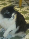 Katten er sort. Hvit i fjeset med en avlang sort flekk på nesen. Hvit på beina og hvit under magen. Lodden under magen. Litt langhåret oppå. Katten virker tillitsfull og veldig kontaktsøkende. Den skriker bare den ser oss og vil inn. Mulig den har gått langt...