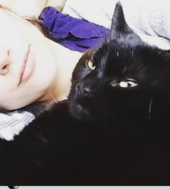Hun er en helsort katt med gulaktige øyne og så vidt litt hvite hår på halsen, knapt synlige.