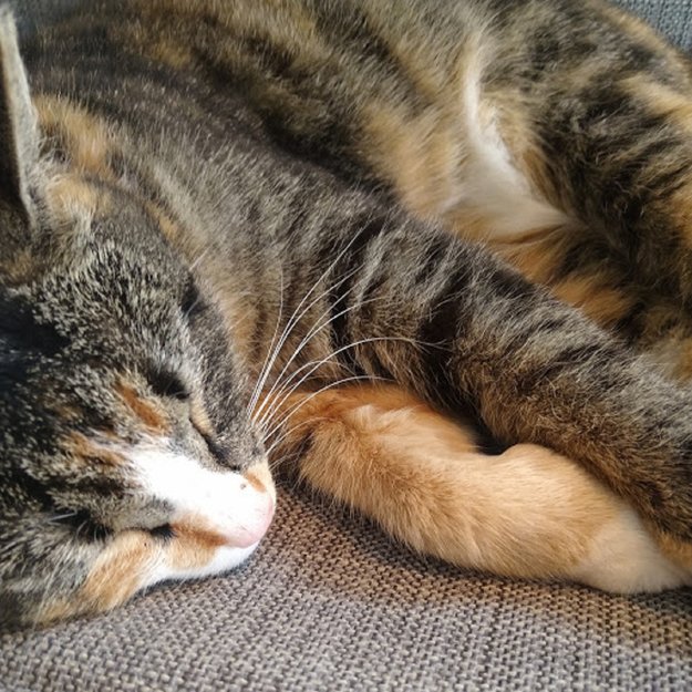 Liten hunnkatt. Ulike farger på hvert av forbena. Ett grått og ett oransje. Sosial og kosete.