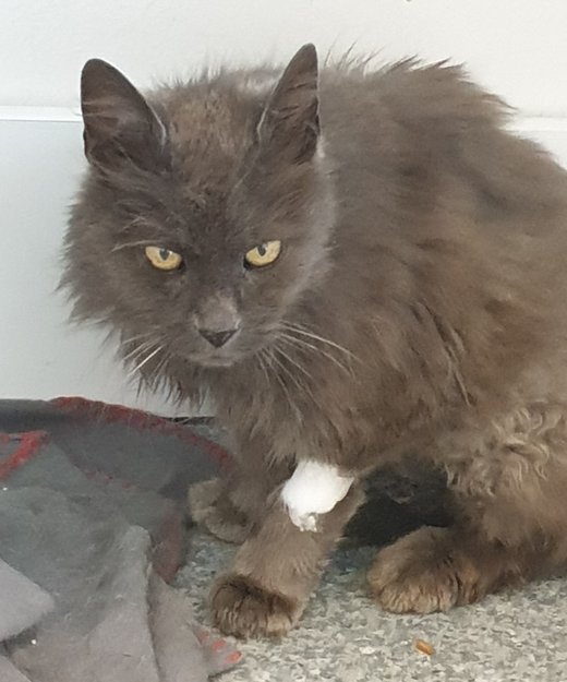 Kastrert, men ingen ID funnet. En brukket hjørnetann, ellers fine tenner, lang flokete pels. Han er grå med innslag av brunt, ikke noe hvit. Dette er en gammel katt, antatt alder mellom 15 og 20 år. Litt stiv i bakparten, sosial og tillitsfull katt. Må ha hatt et godt hjem. Ta kontakt med dyrebeskyttelsen Lillestrøm og omegn dersom noen savner han.