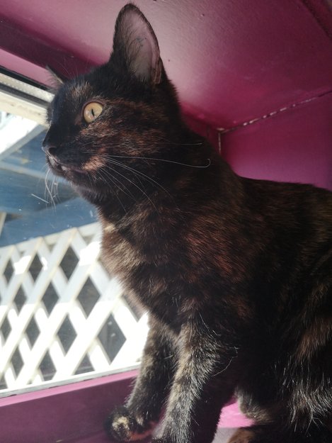 Hun har sort, mørkbrun og lysbrun pels med et hvit værhår. Hun mangler litt pels vedsiden av snuten.