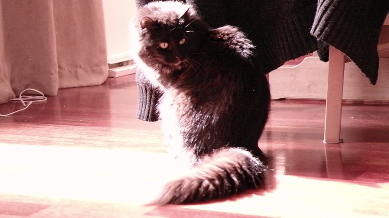 Helsvart, gule øyne og busket hale.