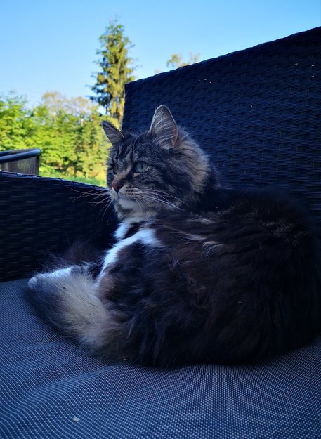Nala er nydelig løveaktig katt med spraglete farger i ansiktet og mer mørk svart/brun pels på ryggen.