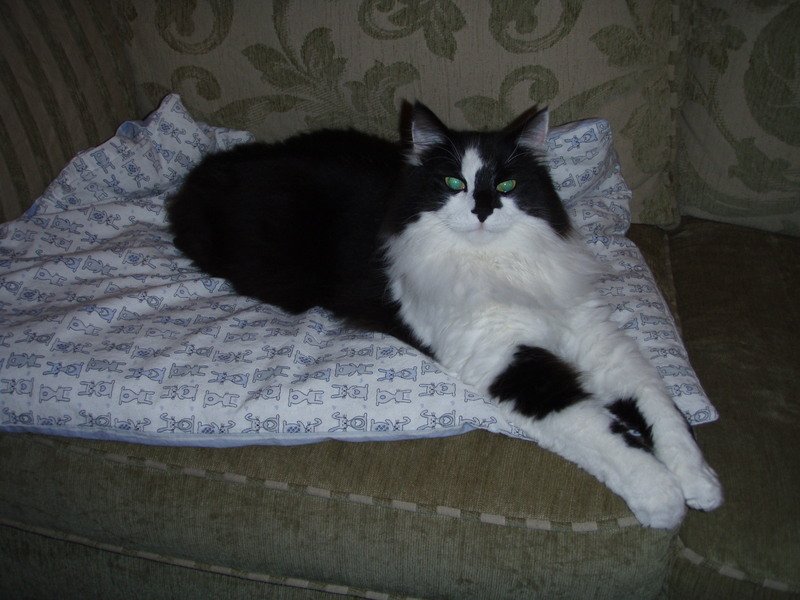 Sort og hvit langhåret hannkatt. Ansiktet er "delt" i to. Lett gjennkjennelig.