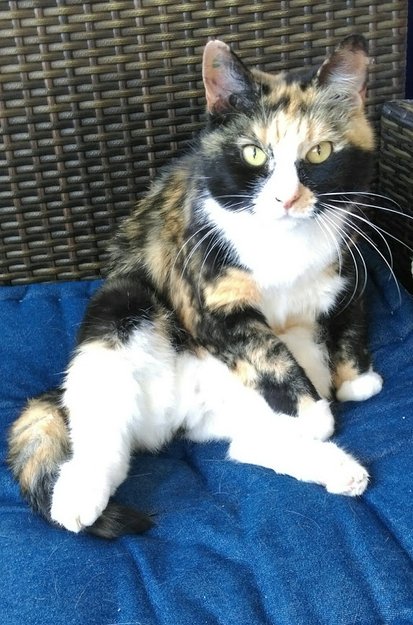 Katten er en tri color med sorte markeringer ved øyepartiet. vekta på katten er 5-6 kg.