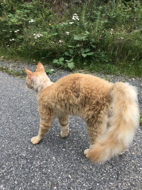Katten er ikke tatt med inn eller lignende. Den har bare fulgt etter oss et stykke og jeg lurer på om noen savner den. Veldig kosete og tillitsfull. Barbert her og der.