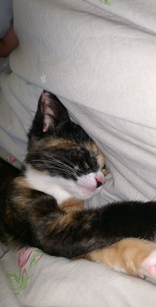 Utrolig liten. Mest svart over ryggen, hvit & oransje i ansiktet. Hun har en rosa nese med en svart flekk på
