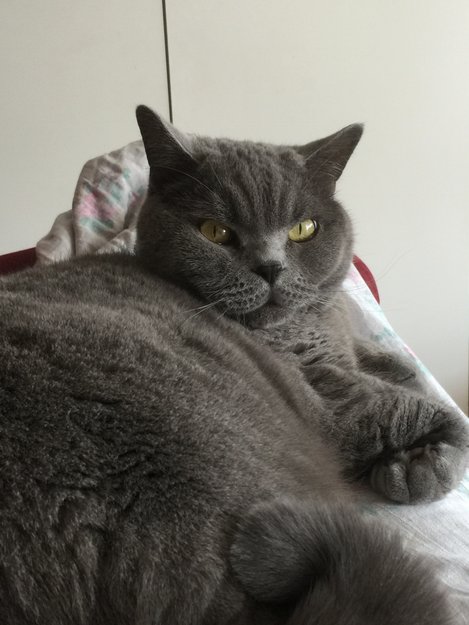 Stor, veldig kjælen og sosial. Liker og kose med bena til folk