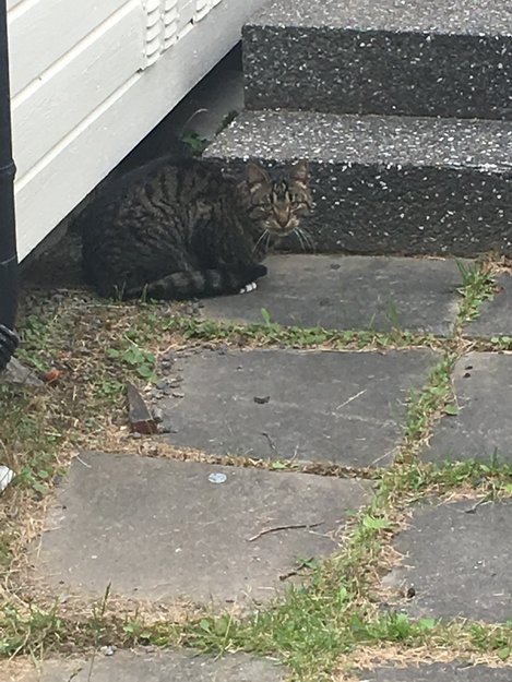 Fin pusekatt kom mjauende utenfor hos oss natt til 5.august. Var ute og kikket, og den ser ikke skadet ut. Veldig kjælen, men litt forsiktig i begynnelsen. Ble stille etter en liten stund, men tilbake igjen formiddag 5.august.
