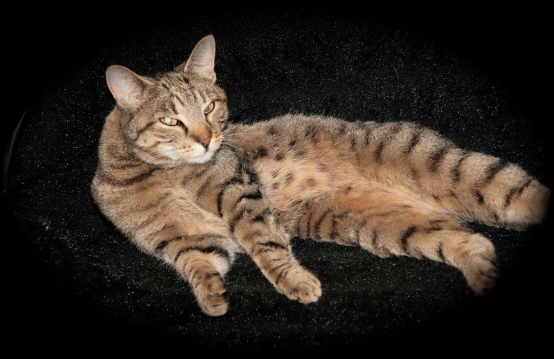 Gule øyne (som går over i grønt innerst mot pupillen). Svart under potene. Symetrisk mønstret med 5 tydelige striper over hodet nedover nakken. Rosa snute med svart markering rundt. Svart markering rundt øynene.