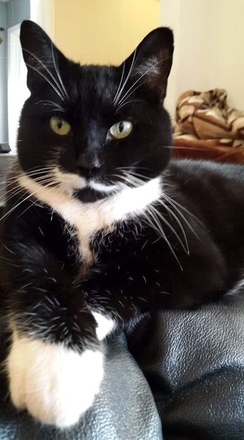 Han er en eldre katt på ca 13 år og er litt rund (varierer på årstidene.) Svart og hvit med en svart flekk på en av bakpotene. Hvit på magen og litt av leppen. Hvite værhår. Svarte poter og nese.