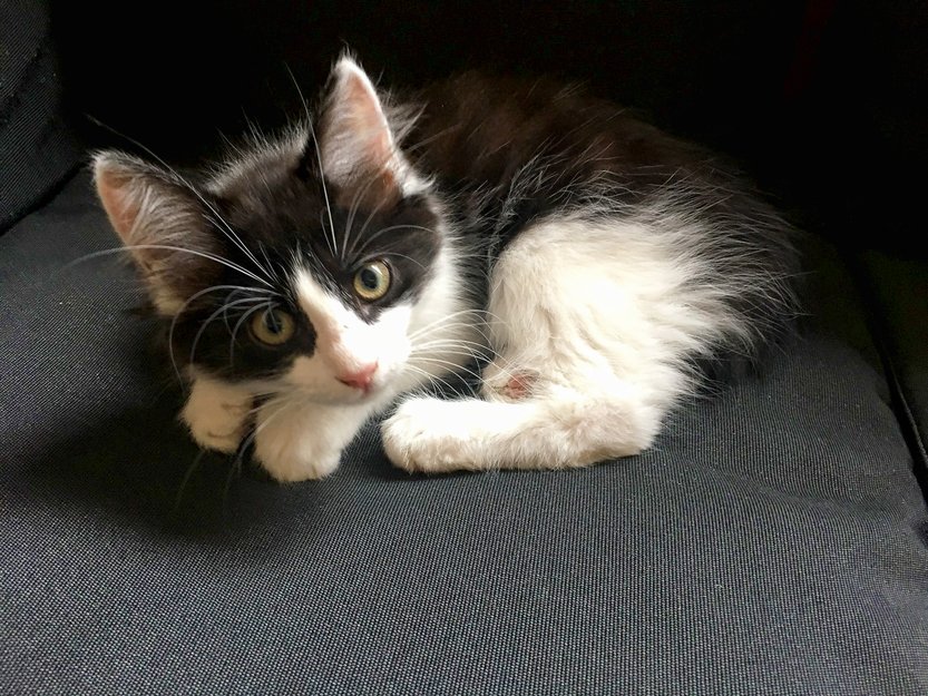 Kattungen, ca 2-3 mnd. gammel, ble funnet i grøfta/bekkeløpet mot skogen utenfor Mistelteinen. Den skrek om hjelp og kom seg ikke opp.