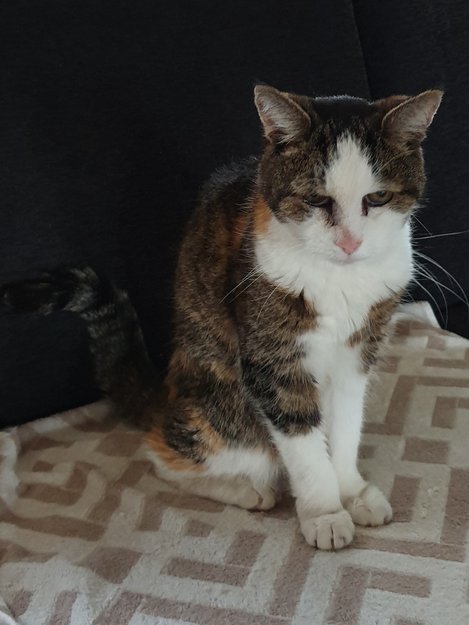 Har en gammel skade på høyre øye som væsker. Virker som hun ser dårlig også. Litt ustø til tider. Er nok en gammel frøken dette.