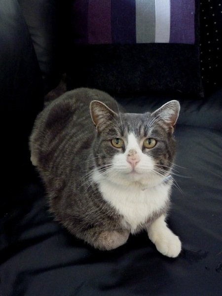 Gråtigret med hvit i ansikt; hals; buk og hvite sokker (flekken på nesa er kun et sår). Snill og kosete.