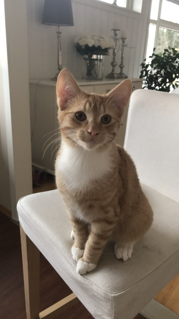 Han kom inn på morgenen for å spise mat, da han er ute om natten. Sitter bestandig utenfor døren på morgenen når vi kommer å åpner. Ble sluppet ut igjen på formiddagen, og siden da har han vært borte. Svært ulikt han å være borte mere enn et døgn.