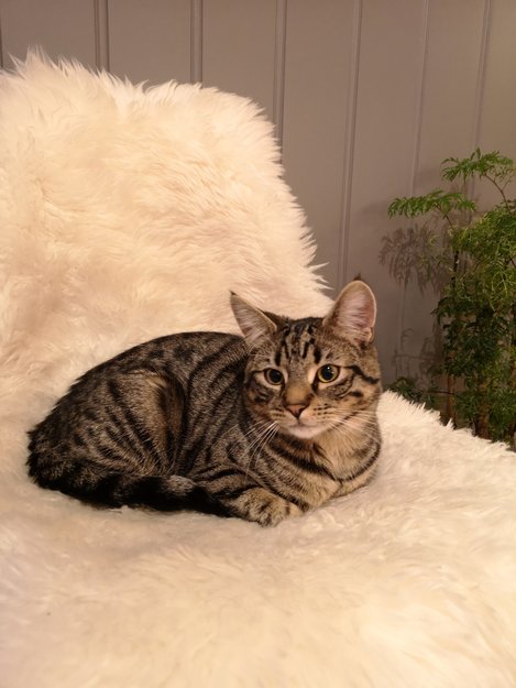 Litt forsiktig av seg, men kjærlig om han lar deg klappe han. Har et hakk i venstre øre (vises ikke på bildet da bildet er tatt før han fikk det). Han er normal i vekt.