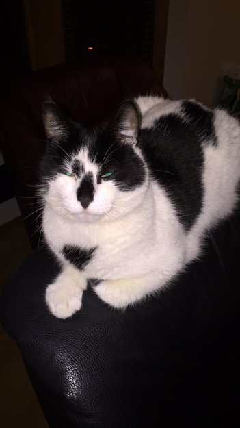 Hun er hvit med svarte områder. Svart "maske" med svart flekk på snuten. Svart flekk på bryst, venstre forpote og på innsiden av venstre bakpote. Svart langs ryggen. 8 år gammel dame som er veldig skeptisk mot fremmede. Er pratsom og høylytt.