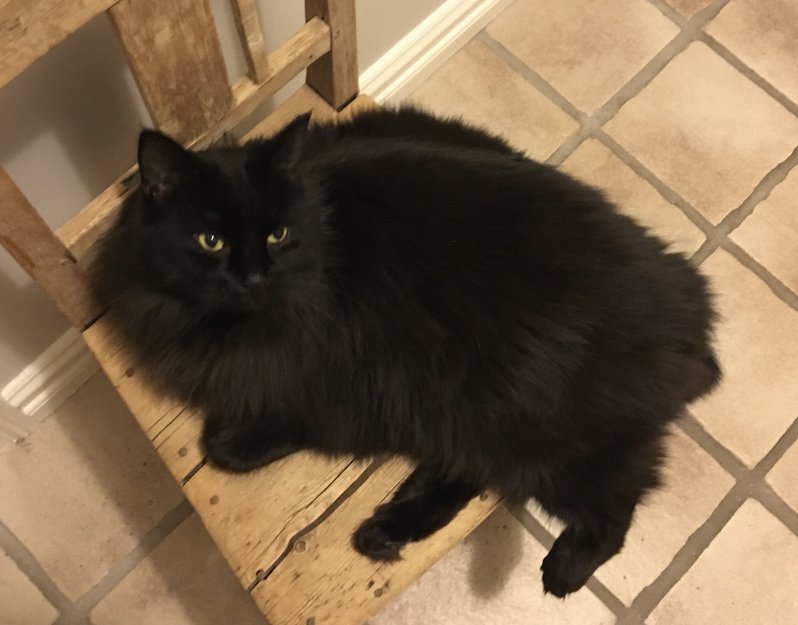 Svart og langhåret. Relativt stor og ganske sky. Har chip som har sklidd ned mot et av bena. Den sitter omtrent på skulderen og vi tror det er på venstre side.