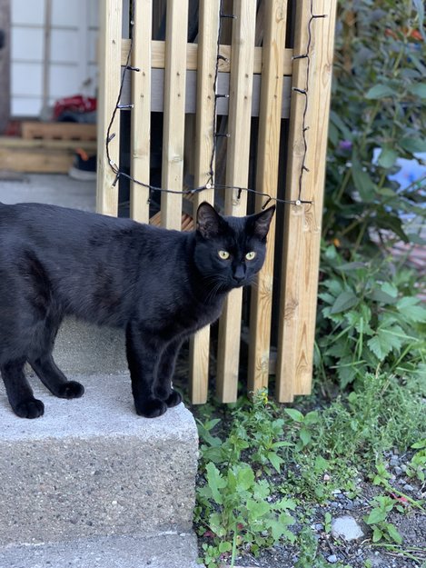 Kattunge med korthåret, sort ensfarget, blank pels. "Full" størrelse (på høyde med voksne katter), men veldig slank/smal i kroppen. Lang hale som vanligvis står rett opp og i en "krøll" øverst (kan være annerledes hvis han er stresset).