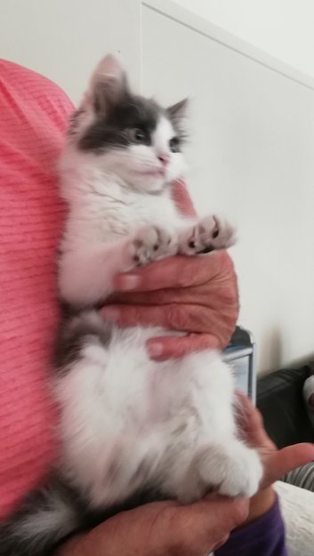 Langhåret grå/hvit kattunge funnet ute. Ca3-4 mnd
